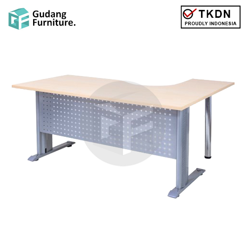 Penambahan modesty pada desain meja simpel berbentuk “L” ini menghadirkan sebuah aksen dekoratif tersendiri pada meja, meskipun dengan cara yang tetap sederhana dan fungsional.