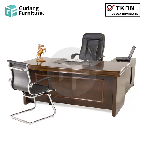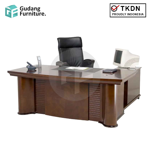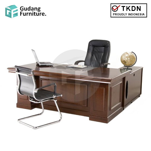 Pilar-pilar kaki meja direktur ini menghiasi meja dengan ukuran relatif besar ini, sehingga padanan warna kayu tua menghadirkan kesan classy pada meja elegan ini.